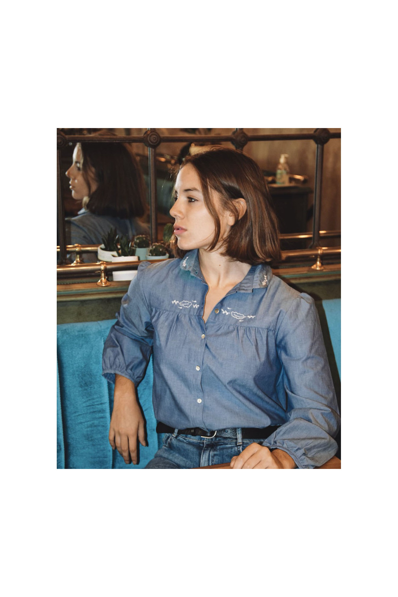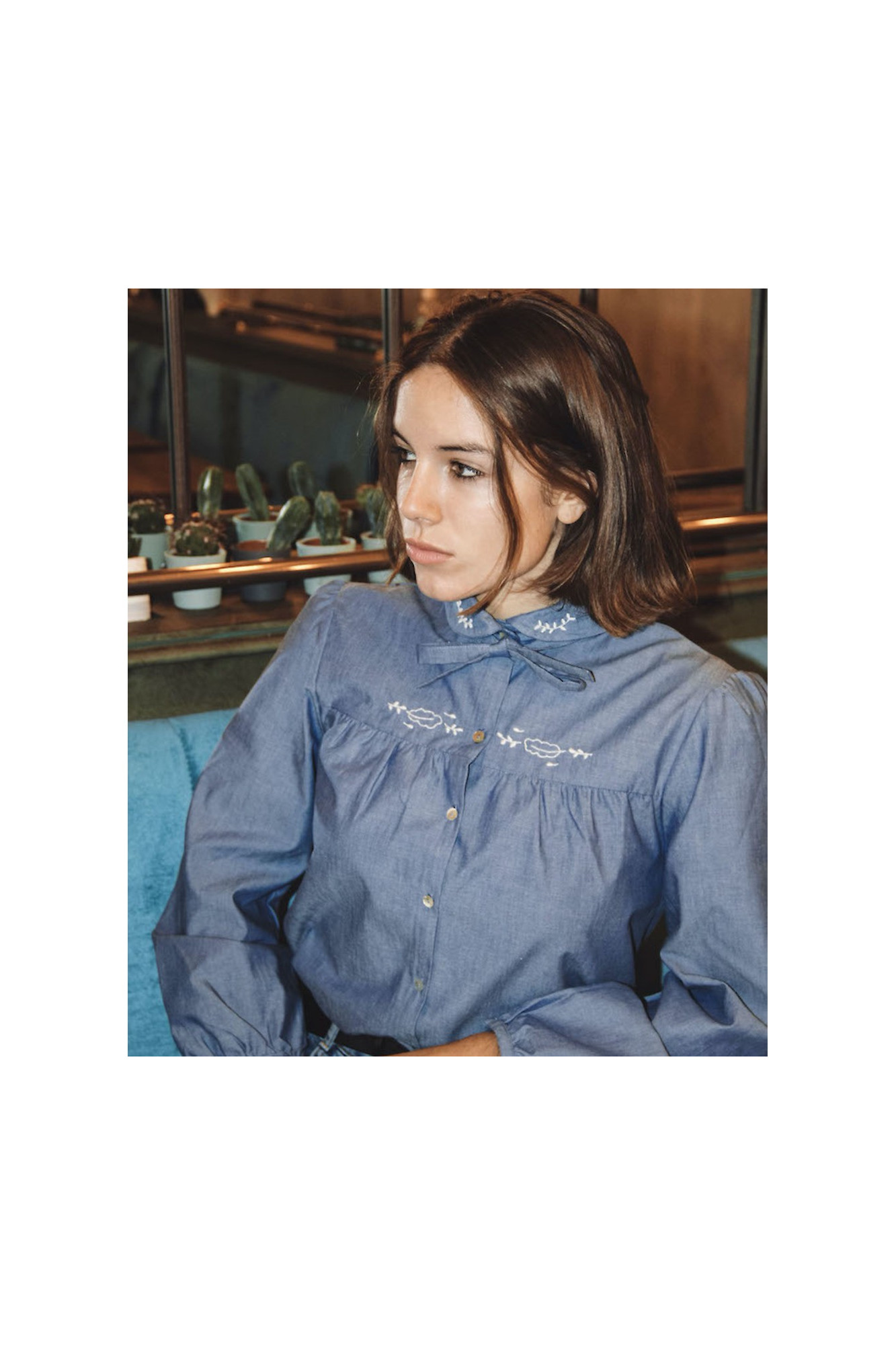 • Buttoned with pretty mother-of-pearl buttons With the Jackie blouse, it's one blouse for 2 styles: the neck tie is fully removable and the blouse can be worn with a little tie on the front for a retro style or with the neck open for a more casual look. You will love the refinement of the handmade embroidery on a very high quality organic cotton chambray.