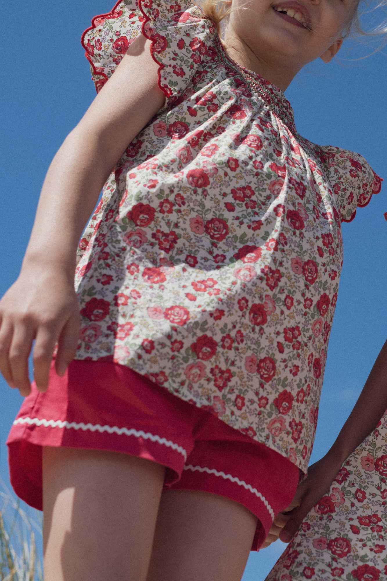 The Paloma blouse embraces a bohemian chic style with contrasting smocking and embroidery on authentic floral Liberty fabric. We love its fully smocked and hand-embroidered neckline, delicately scalloped butterfly sleeves, and vibrant Liberty Felicite fabric that adds a pop of color to any outfit this season.